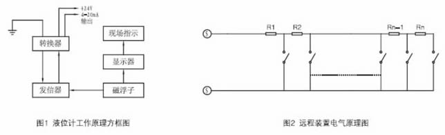 液位遠傳裝置亦是根據磁鋼特性通過干簧管組及轉換器將液位的變化轉換成4~20mA標準信號,進行遠傳實現液位的測量、記錄和控制。如圖1、2所示